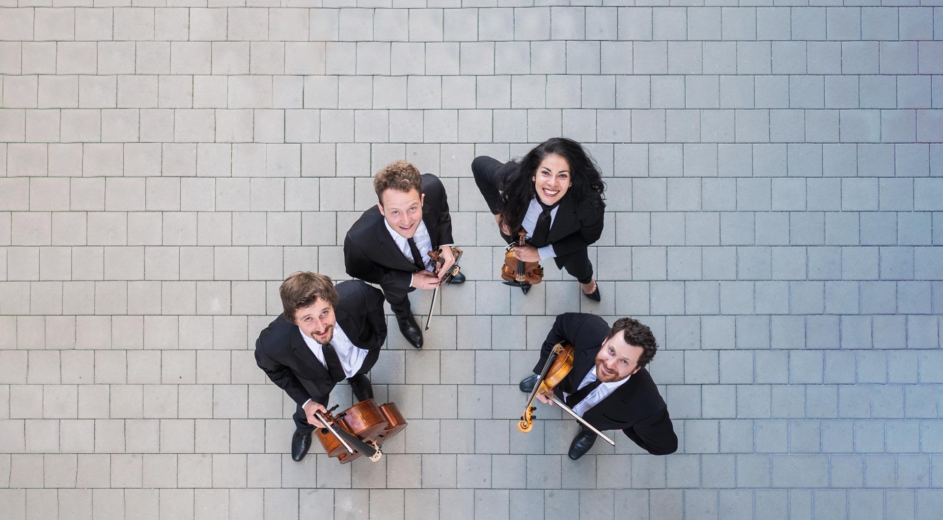 Feuerbach Quartett - Foto von oben mit 4 Personen im Anzug und Instrumenten